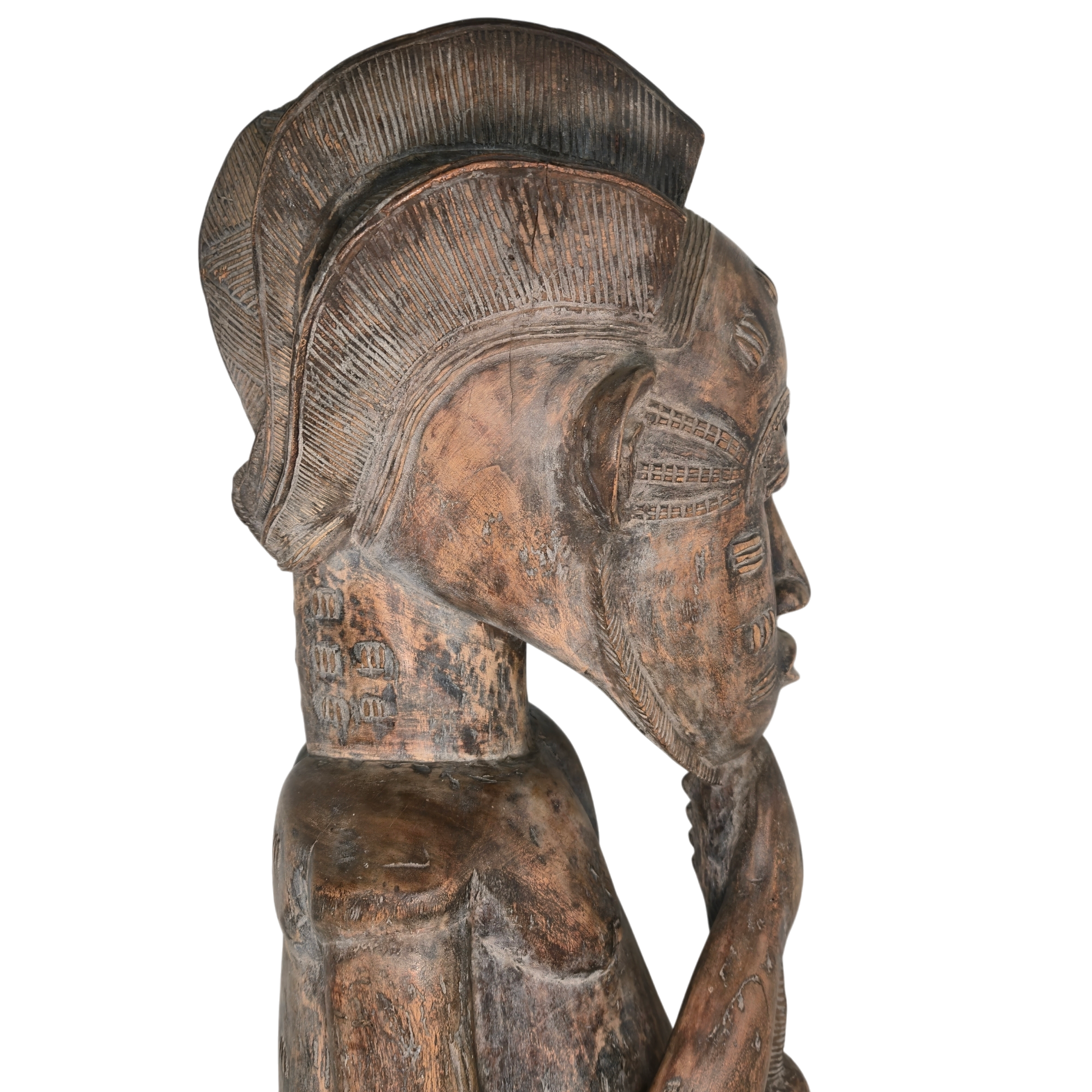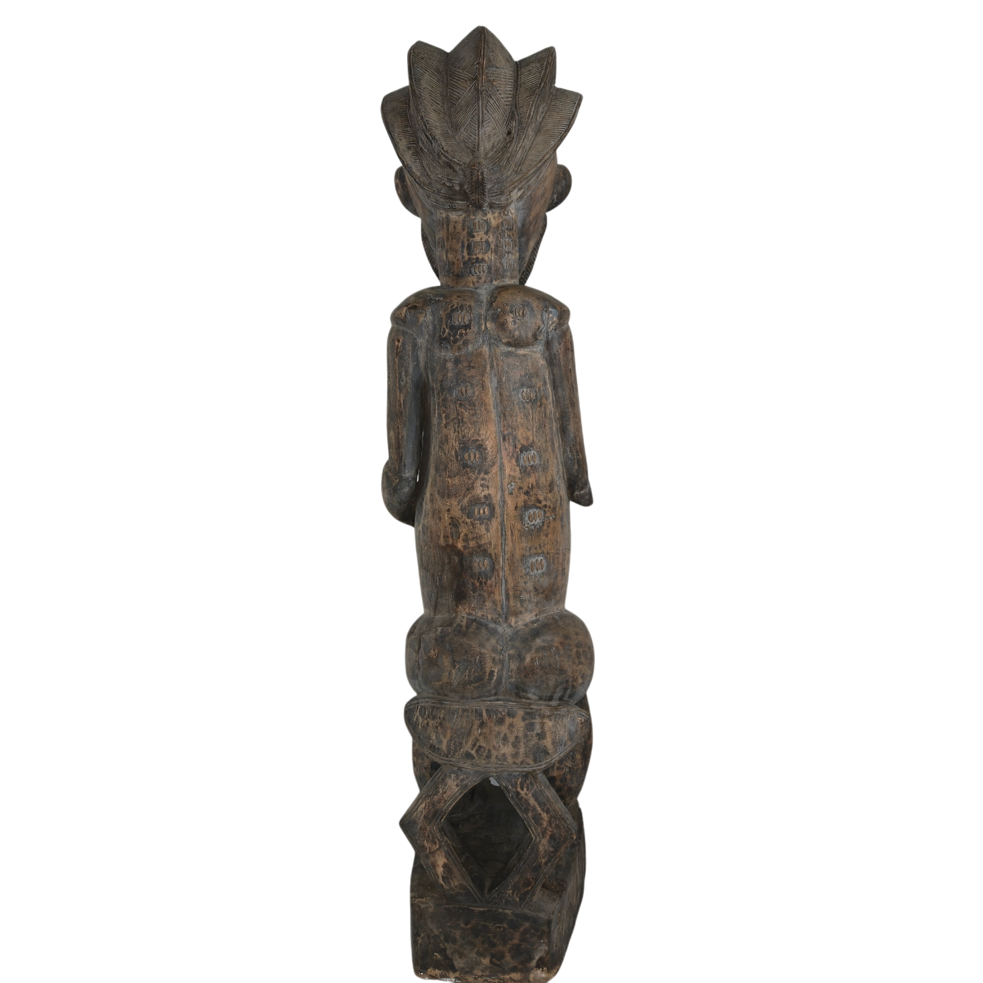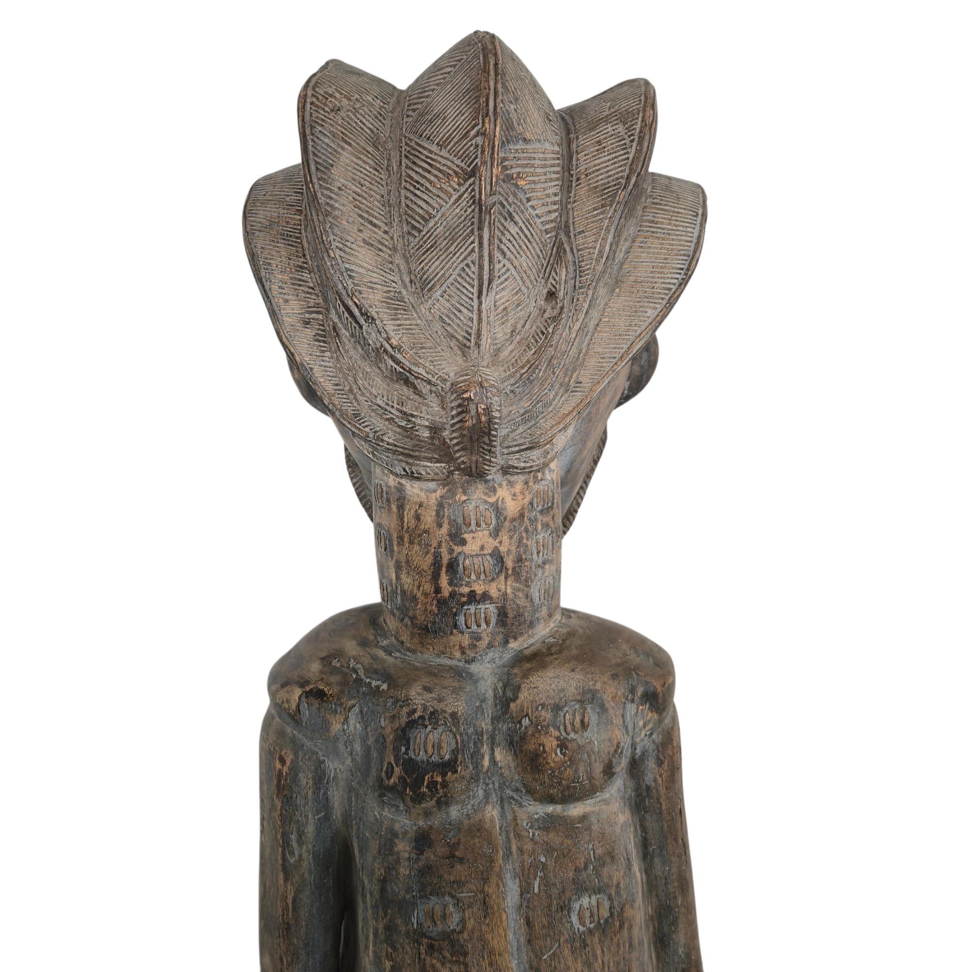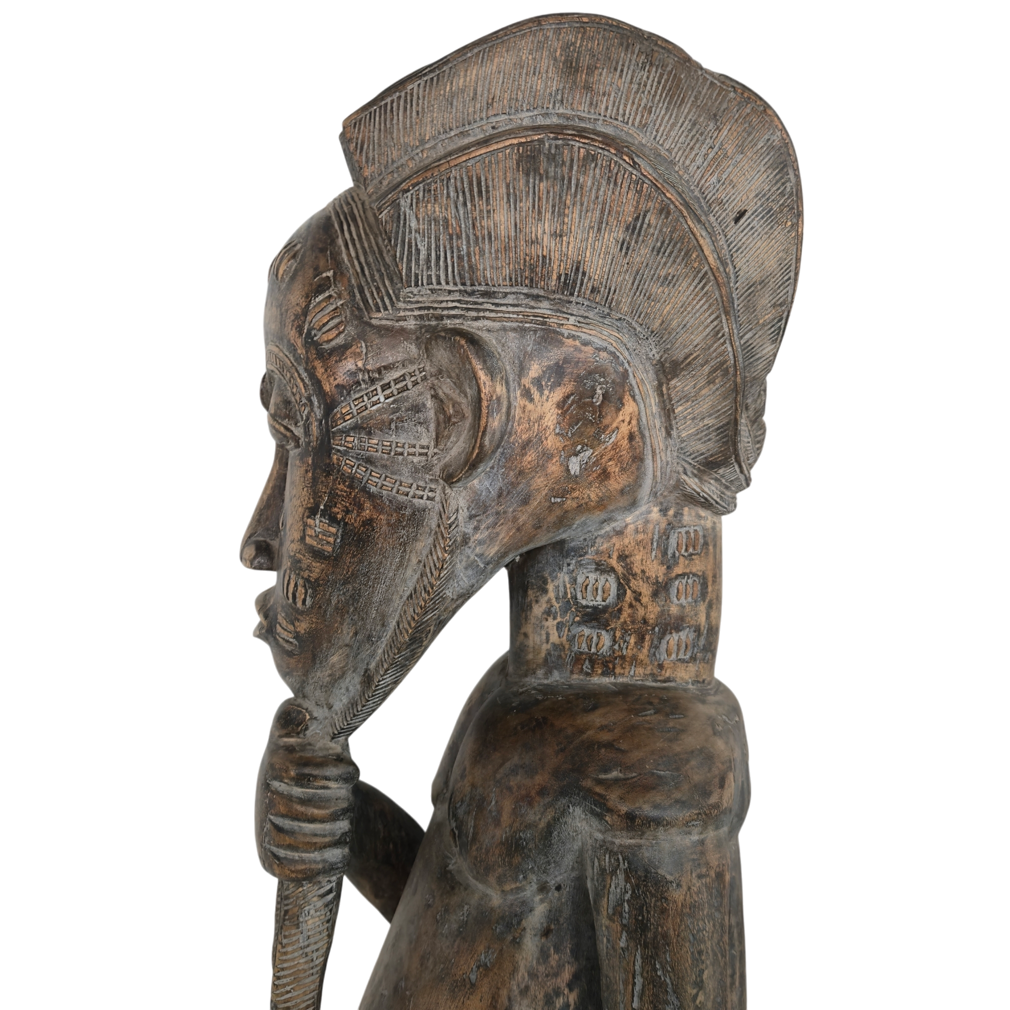 The elaborate hairstyle, facial scarifications, and majestic presence highlight the elevated rank of the character. Such monumental statues were traditionally created to honor ancestors, assert the political authority of a lineage, or be displayed in ritual or communal spaces.