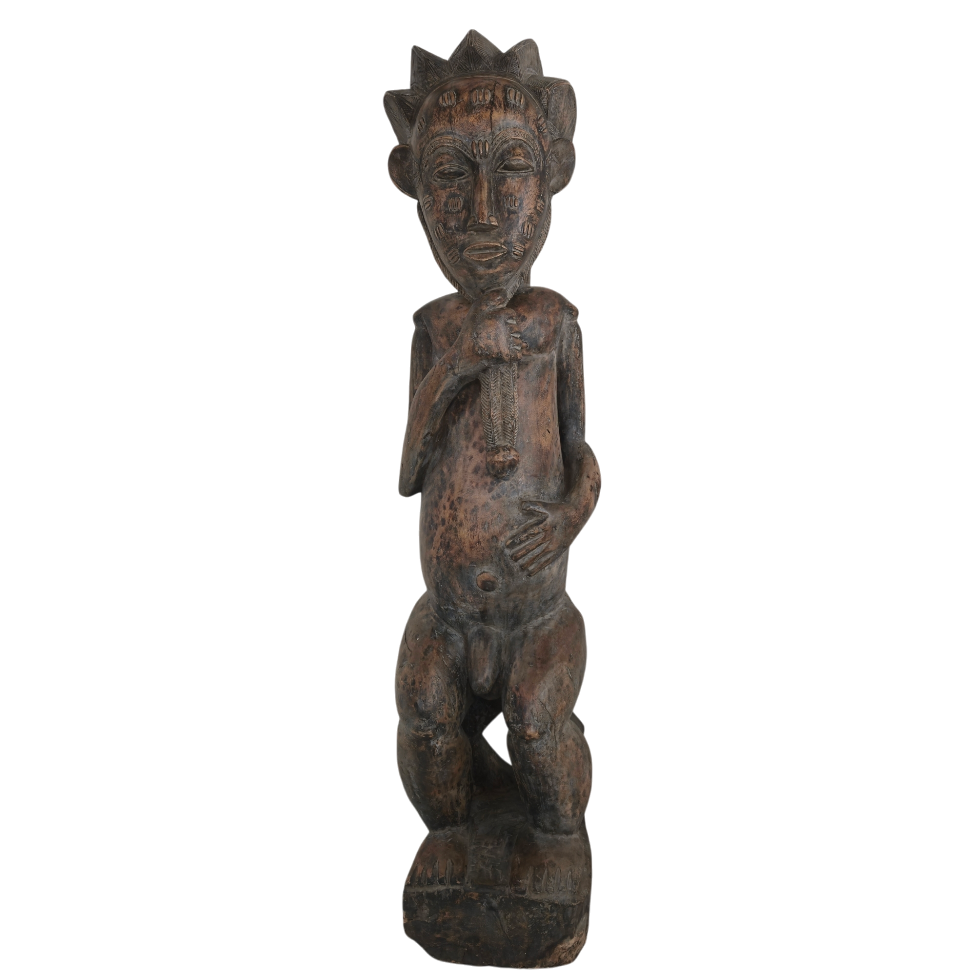 This impressive wooden statue, measuring 1m44 in height and weighing 43.4 kg, represents a Baoulé chief from Ivory Coast. Carefully carved, it embodies power, authority, and prosperity. The figure is depicted standing, holding a scepter in his right hand – a symbol of command – while his left hand rests on his belly, evoking fertility and inner strength.